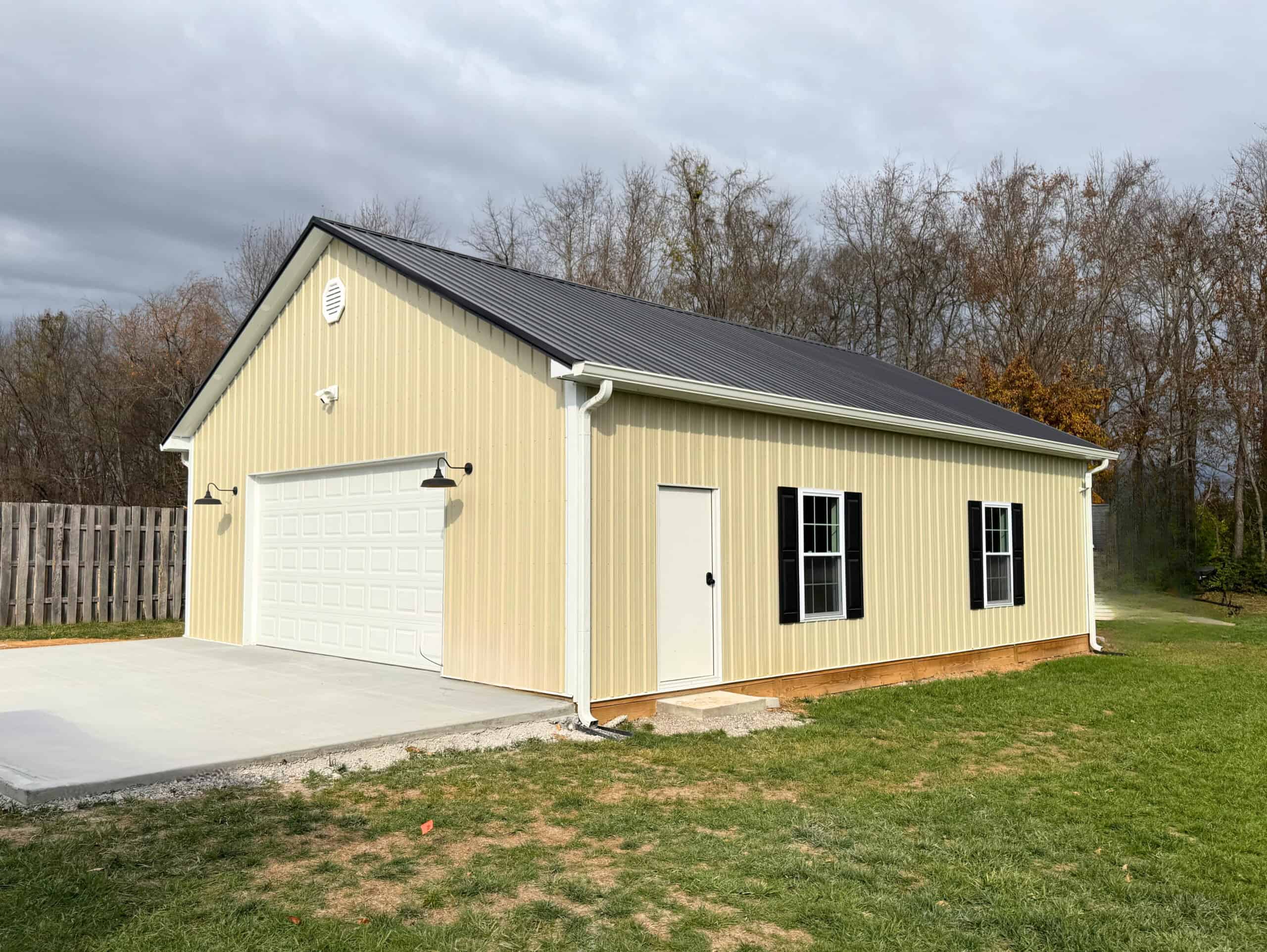 This 30×40×10 shop is perfectly tucked behind a neighborhood home, offering functional space without overpowering a smaller lot. With 1,200 sq ft of room, it provides excellent storage for vehicles, toys, tools, and more.